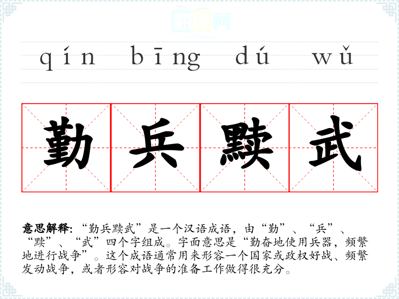 “勤兵黩武”是一个汉语成语,由“勤”、“兵”、“黩”、“武”四个字组成。字面意思是“勤奋地使用兵器,频繁地进行战争”。这个成语通常用来形容一个国家或政权好战、频繁发动战争,或者形容对战争的准备工作做得很充分。