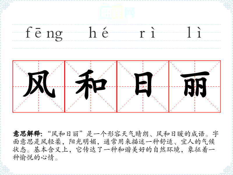 - 日常对话:人们在谈论天气时常用此成语,比如“今天真是风和日丽,适合出去游玩。”
