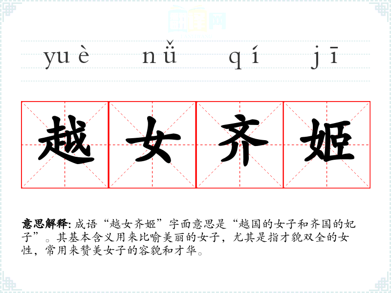 成语“越女齐姬”字面意思是“越国的女子和齐国的妃子”。其基本含义用来比喻美丽的女子,尤其是指才貌双全的女性,常用来赞美女子的容貌和才华。