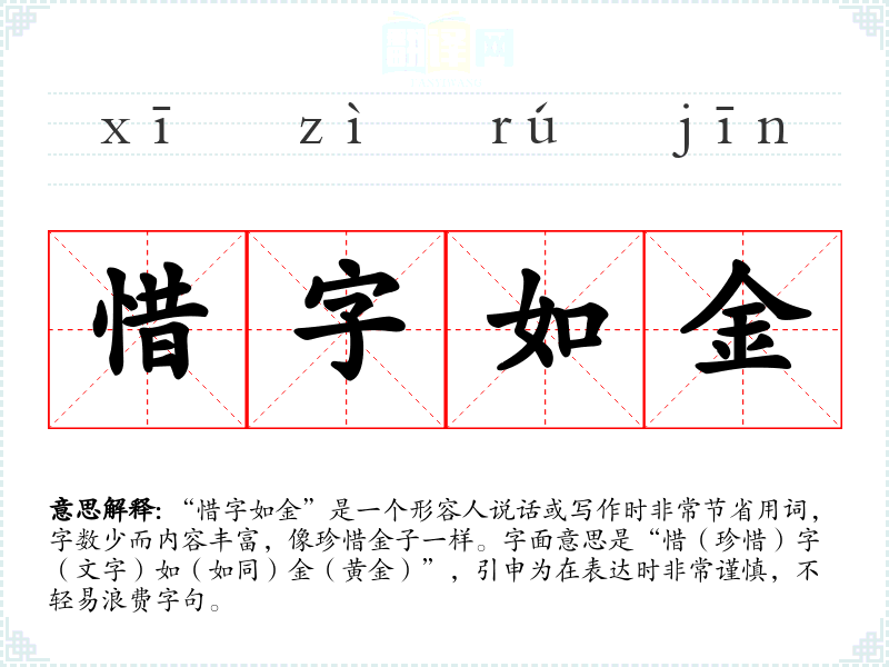 “惜字如金”是一个形容人说话或写作时非常节省用词,字数少而内容丰富,像珍惜金子一样。字面意思是“惜(珍惜)字(文字)如(如同)金(黄金)”,引申为在表达时非常谨慎,不轻易浪费字句。