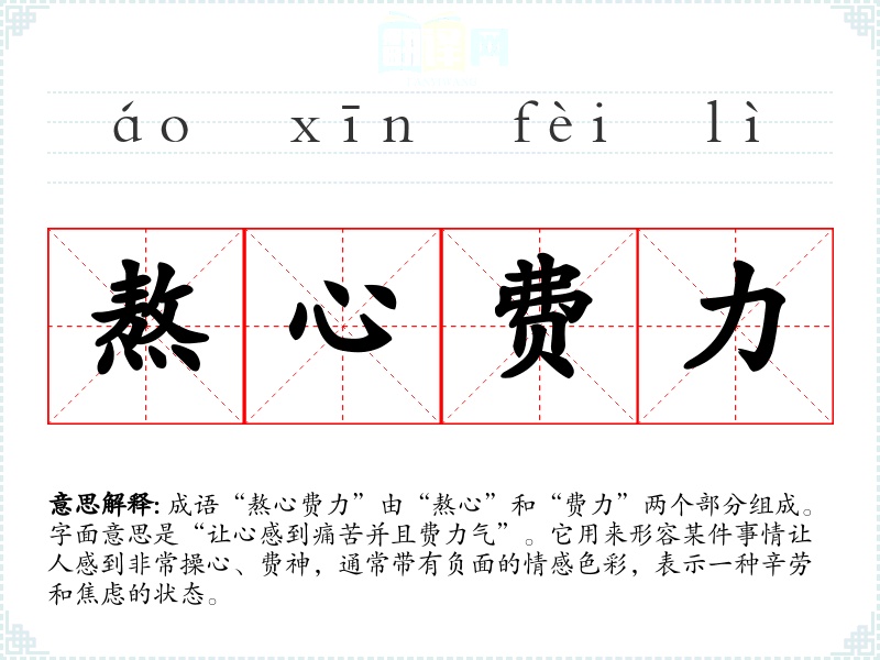 成语“熬心费力”由“熬心”和“费力”两个部分组成。字面意思是“让心感到痛苦并且费力气”。它用来形容某件事情让人感到非常操心、费神,通常带有负面的情感色彩,表示一种辛劳和焦虑的状态。