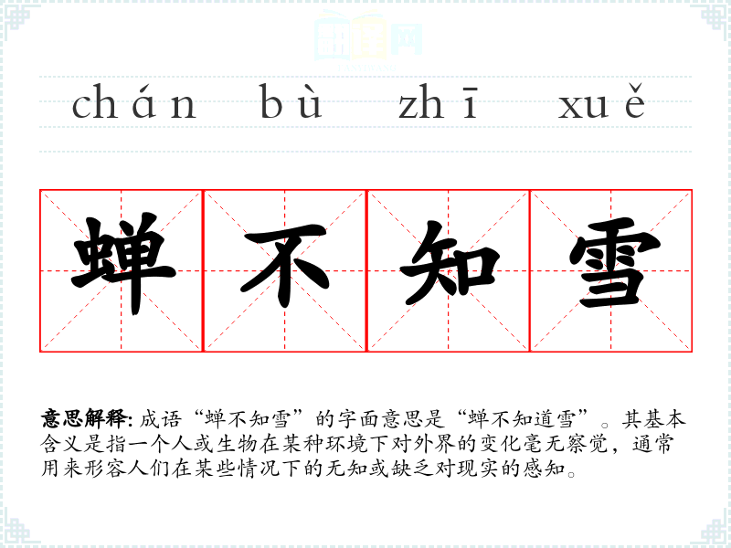 成语“蝉不知雪”的字面意思是“蝉不知道雪”。其基本含义是指一个人或生物在某种环境下对外界的变化毫无察觉,通常用来形容人们在某些情况下的无知或缺乏对现实的感知。