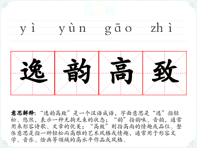 在英语中,虽然没有直接对应“逸韵高致”的成语,但可以用“elegant sophistication”或“refined beauty”来表达相似的意思。这些表达同样强调了一种高雅的艺术风格和品位。