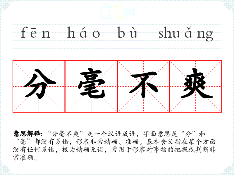 “分毫不爽”是一个汉语成语,字面意思是“分”和“毫”都没有差错,形容非常精确、准确。基本含义指在某个方面没有任何差错,极为精确无误,常用于形容对事物的把握或判断非常准确。