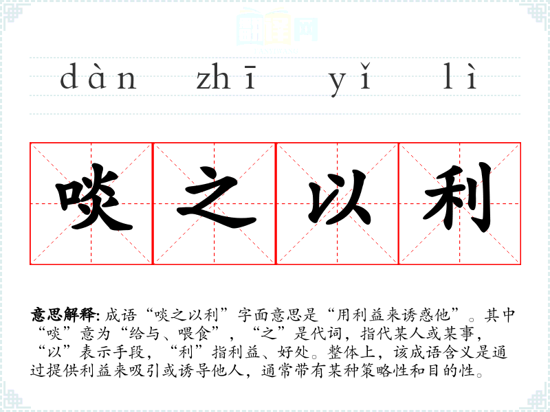 成语“啖之以利”字面意思是“用利益来诱惑他”。其中“啖”意为“给与、喂食”,“之”是代词,指代某人或某事,“以”表示手段,“利”指利益、好处。整体上,该成语含义是通过提供利益来吸引或诱导他人,通常带有某种策略性和目的性。