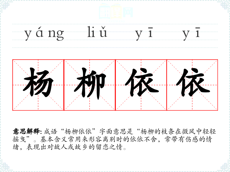 成语“杨柳依依”字面意思是“杨柳的枝条在微风中轻轻摇曳”。基本含义常用来形容离别时的依依不舍,常带有伤感的情绪,表现出对故人或故乡的留恋之情。