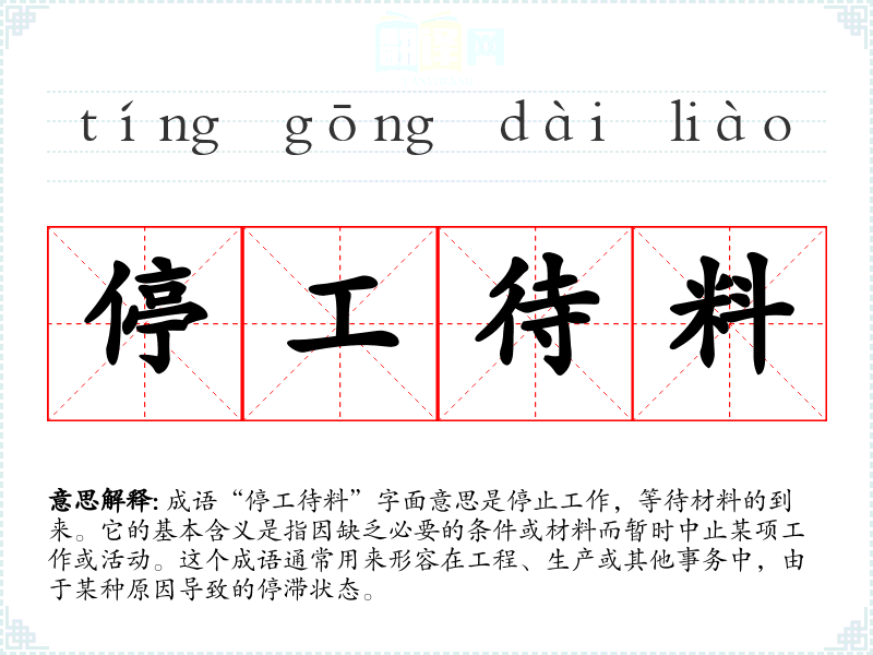 “停工待料”并没有明确的历史典故,但结合其字面结构可以推测出其来源与工匠、工程施工等活动有关。在古代,工匠在进行某项工程时,常常需要依赖特定的材料,一旦材料未到,就只能停止工作等待。这个成语反映了人们在实际工作中遇到的困境。
