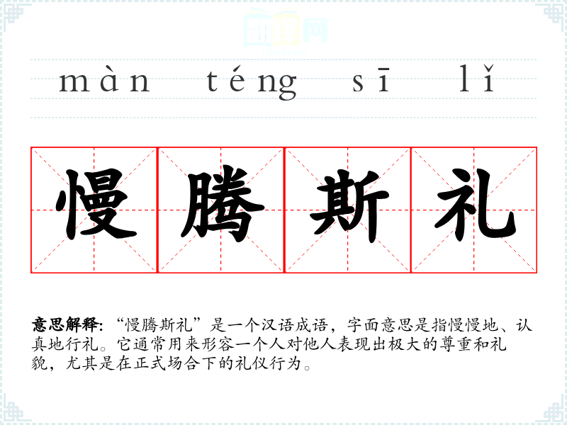 “慢腾斯礼”是一个汉语成语,字面意思是指慢慢地、认真地行礼。它通常用来形容一个人对他人表现出极大的尊重和礼貌,尤其是在正式场合下的礼仪行为。