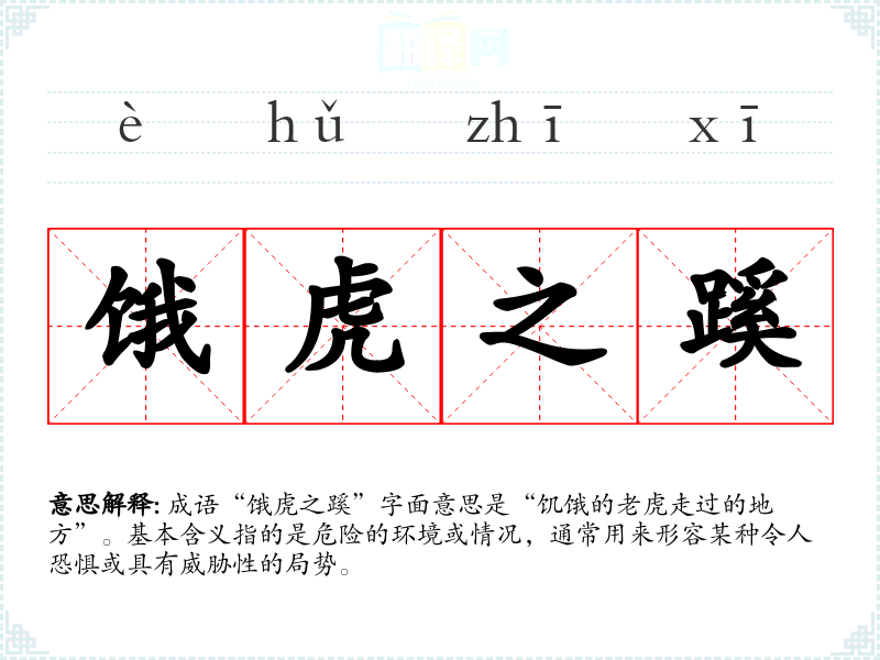 成语“饿虎之蹊”字面意思是“饥饿的**走过的地方”。基本含义指的是危险的环境或情况,通常用来形容某种令人恐惧或具有威胁性的局势。