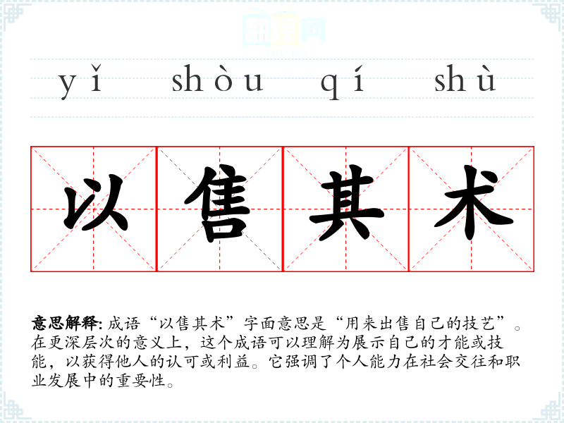 成语“以售其术”字面意思是“用来出售自己的技艺”。在更深层次的意义上,这个成语可以理解为展示自己的才能或技能,以获得他人的认可或利益。它强调了个人能力在社会交往和职业发展中的重要性。