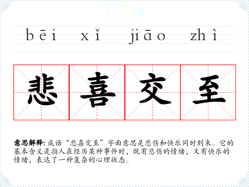 - “喜忧参半”:表示快乐和忧愁并存,和“悲喜交至”相似,强调情感的复杂性。