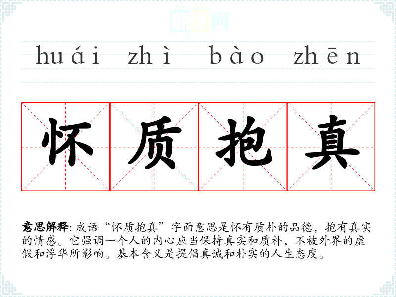 成语“怀质抱真”字面意思是怀有质朴的品德,抱有真实的情感。它强调一个人的内心应当保持真实和质朴,不被外界的虚假和浮华所影响。基本含义是提倡真诚和朴实的人生态度。