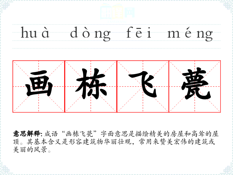 成语“画栋飞甍”字面意思是描绘精美的房屋和高耸的屋顶。其基本含义是形容建筑物华丽壮观,常用来赞美宏伟的建筑或美丽的风景。