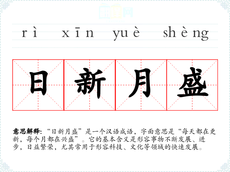 “日新月盛”是一个汉语成语,字面意思是“每天都在更新,每个月都在兴盛”。它的基本含义是形容事物不断发展、进步,日益繁荣,尤其常用于形容科技、文化等领域的快速发展。