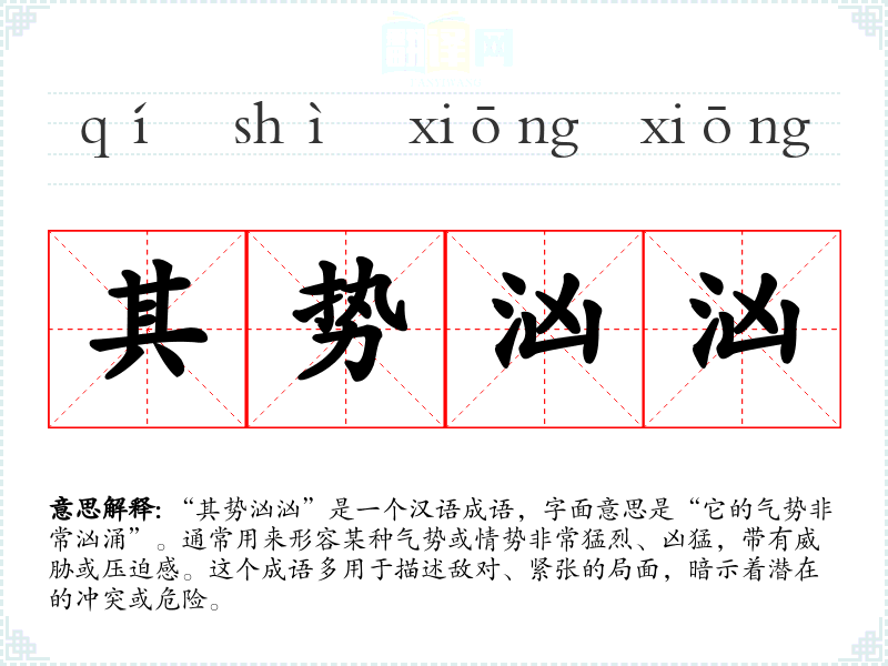 在英语中,可以用“intimidating”或“ominous”来表达类似的含义,尤其在描述气氛紧张或威胁感时。然而,这些词汇的使用场景和语感与“其势汹汹”可能存在细微差别,前者更多强调的是对个人的威慑,而后者更侧重于整体情势的描述。