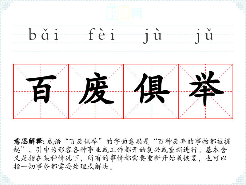 成语“百废俱举”的字面意思是“百种废弃的事物都被提起”,引申为形容各种事业或工作都开始复兴或重新进行。基本含义是指在某种情况下,所有的事情都需要重新开始或恢复,也可以指一切事务都需要处理或解决。