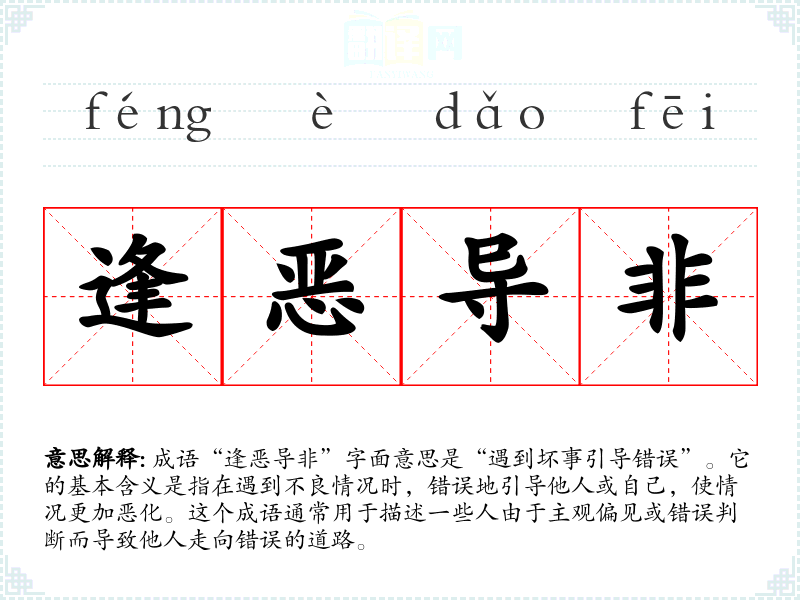 成语“逢恶导非”字面意思是“遇到坏事引导错误”。它的基本含义是指在遇到不良情况时,错误地引导他人或自己,使情况更加恶化。这个成语通常用于描述一些人由于主观偏见或错误判断而导致他人走向错误的道路。