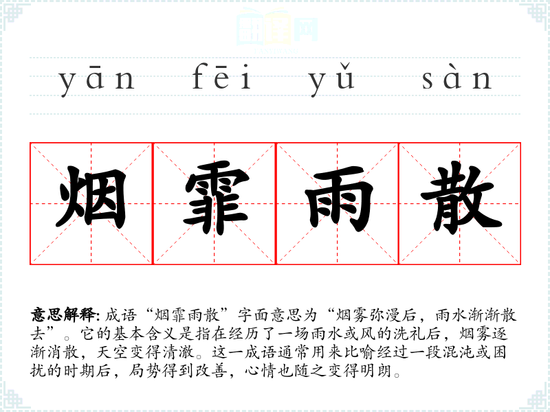 成语“烟霏雨散”字面意思为“烟雾弥漫后,雨水渐渐散去”。它的基本含义是指在经历了一场雨水或风的洗礼后,烟雾逐渐消散,天空变得清澈。这一成语通常用来比喻经过一段混沌或困扰的时期后,局势得到改善,心情也随之变得明朗。