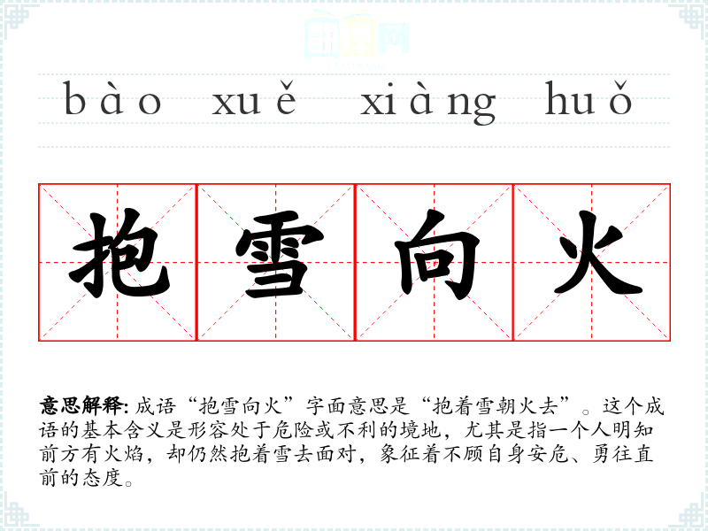 成语“抱雪向火”字面意思是“抱着雪朝火去”。这个成语的基本含义是形容处于危险或不利的境地,尤其是指一个人明知前方有火焰,却仍然抱着雪去面对,象征着不顾自身安危、勇往直前的态度。