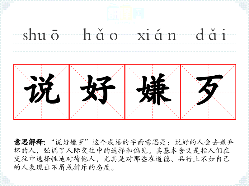 “说好嫌歹”这个成语的字面意思是:说好的人会去嫌弃坏的人,强调了人际交往中的选择和偏见。其基本含义是指人们在交往中选择性地对待他人,尤其是对那些在道德、品行上不如自己的人表现出不屑或排斥的态度。