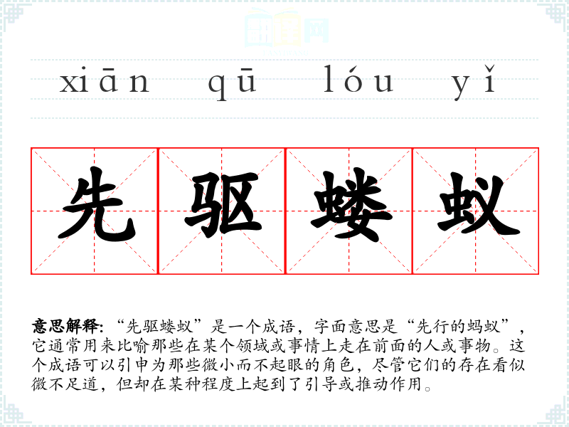 “先驱蝼蚁”是一个成语,字面意思是“先行的蚂蚁”,它通常用来比喻那些在某个领域或事情上走在前面的人或事物。这个成语可以引申为那些微小而不起眼的角色,尽管它们的存在看似微不足道,但却在某种程度上起到了引导或推动作用。