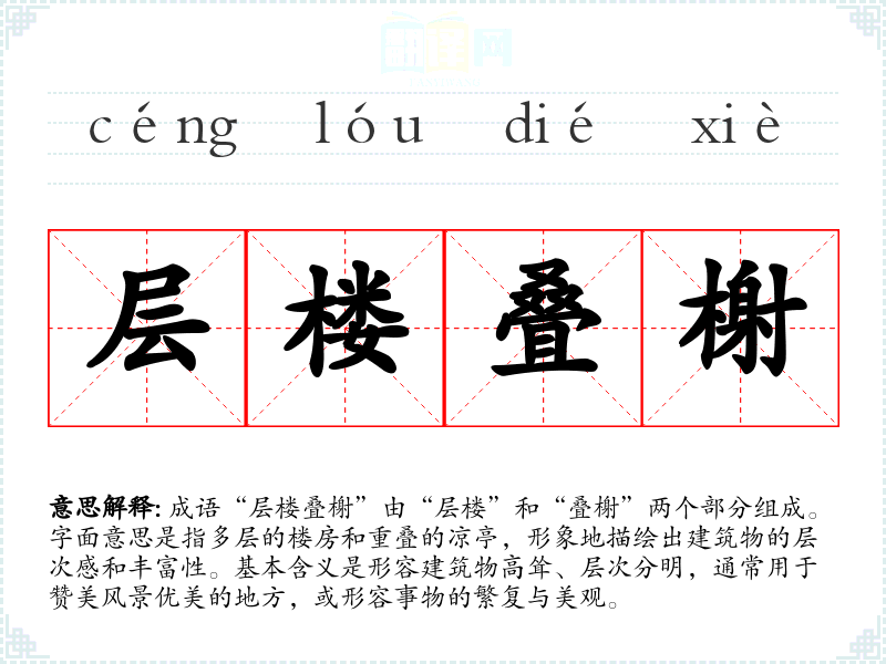 成语“层楼叠榭”由“层楼”和“叠榭”两个部分组成。字面意思是指多层的楼房和重叠的凉亭,形象地描绘出建筑物的层次感和丰富性。基本含义是形容建筑物高耸、层次分明,通常用于赞美风景优美的地方,或形容事物的繁复与美观。