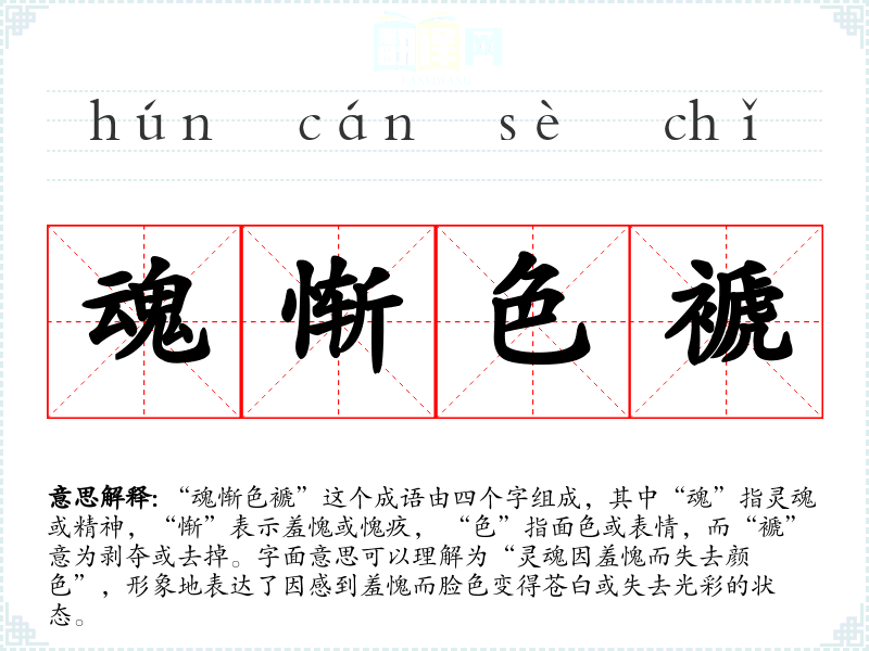 “魂惭色褫”这个成语由四个字组成,其中“魂”指灵魂或精神,“惭”表示羞愧或愧疚, “色”指面色或表情,而“褫”意为剥夺或去掉。字面意思可以理解为“灵魂因羞愧而失去颜色”,形象地表达了因感到羞愧而脸色变得苍白或失去光彩的状态。