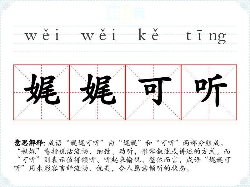 成语“娓娓可听”由“娓娓”和“可听”两部分组成。“娓娓”意指说话流畅、细致、动听,形容叙述或讲述的方式。而“可听”则表示值得倾听、听起来愉悦。整体而言,成语“娓娓可听”用来形容言辞流畅、优美,令人愿意倾听的状态。