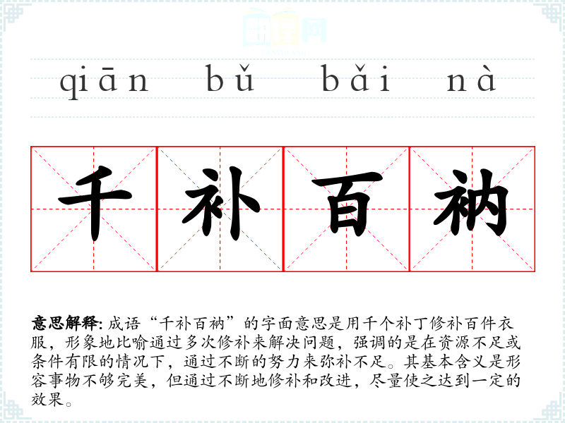 成语“千补百衲”的字面意思是用千个补丁修补百件衣服,形象地比喻通过多次修补来解决问题,强调的是在资源不足或条件有限的情况下,通过不断的努力来弥补不足。其基本含义是形容事物不够完美,但通过不断地修补和改进,尽量使之达到一定的效果。