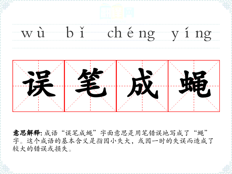 成语“误笔成蝇”字面意思是用笔错误地写成了“蝇”字。这个成语的基本含义是指因小失大,或因一时的失误而造成了较大的错误或损失。
