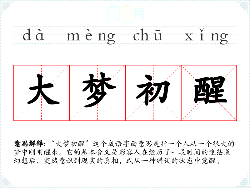 “大梦初醒”这个成语字面意思是指一个人从一个很大的梦中刚刚醒来。它的基本含义是形容人在经历了一段时间的迷茫或幻想后,突然意识到现实的真相,或从一种错误的状态中觉醒。