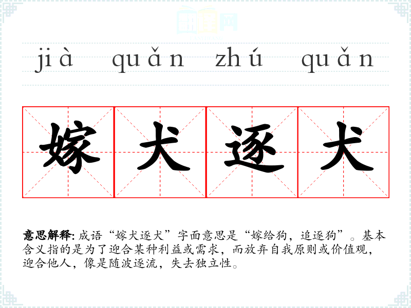 成语“嫁犬逐犬”字面意思是“嫁给狗,追逐狗”。基本含义指的是为了迎合某种利益或需求,而放弃自我原则或价值观,迎合他人,像是随波逐流,失去独立性。