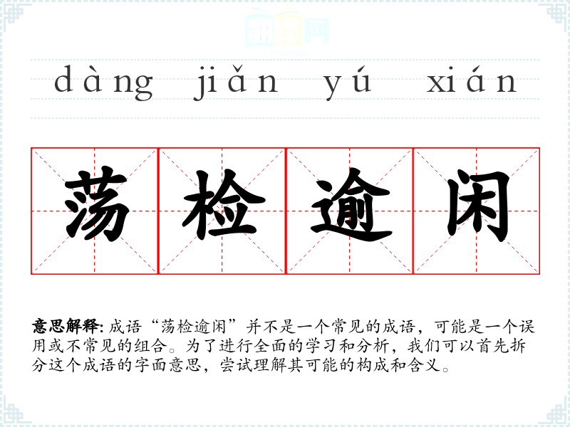 成语“荡检逾闲”并不是一个常见的成语,可能是一个误用或不常见的组合。为了进行全面的学习和分析,我们可以首先拆分这个成语的字面意思,尝试理解其可能的构成和含义。