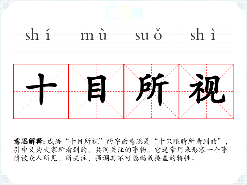 成语“十目所视”的字面意思是“十只眼睛所看到的”,引申义为大家所看到的、共同关注的事物。它通常用来形容一个事情被众人所见、所关注,强调其不可隐瞒或掩盖的特性。
