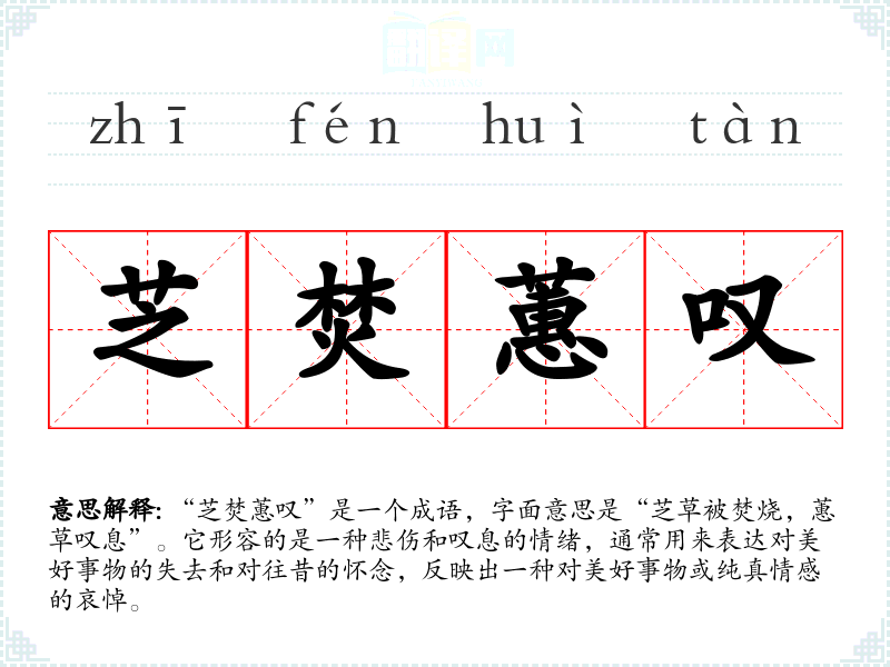 在英语中,类似的表达可能是“nostalgia”,这种情感同样反映了对过去美好时光的怀念和对失去的惋惜。然而,“芝焚蕙叹”更加集中于对高洁事物的追求与失落,带有更深的文化内涵。