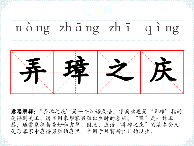 “弄璋之庆”源自《礼记·檀弓下》,文中提到:“君子之道,乃为父母,故为之庆。”其中提到男孩出生的喜庆,因男孩通常被视为传宗接代的希望。这个成语体现了古代社会对男孩出生的重视,反映出当时的文化和家庭观念。