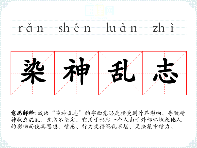 成语“染神乱志”的字面意思是指受到外界影响,导致精神状态混乱、意志不坚定。它用于形容一个人由于外部环境或他人的影响而使其思想、情感、行为变得混乱不堪,无法集中精力。