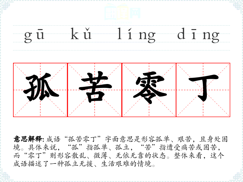 | 孤苦零丁 | 形容孤单困苦,无依无靠。 |