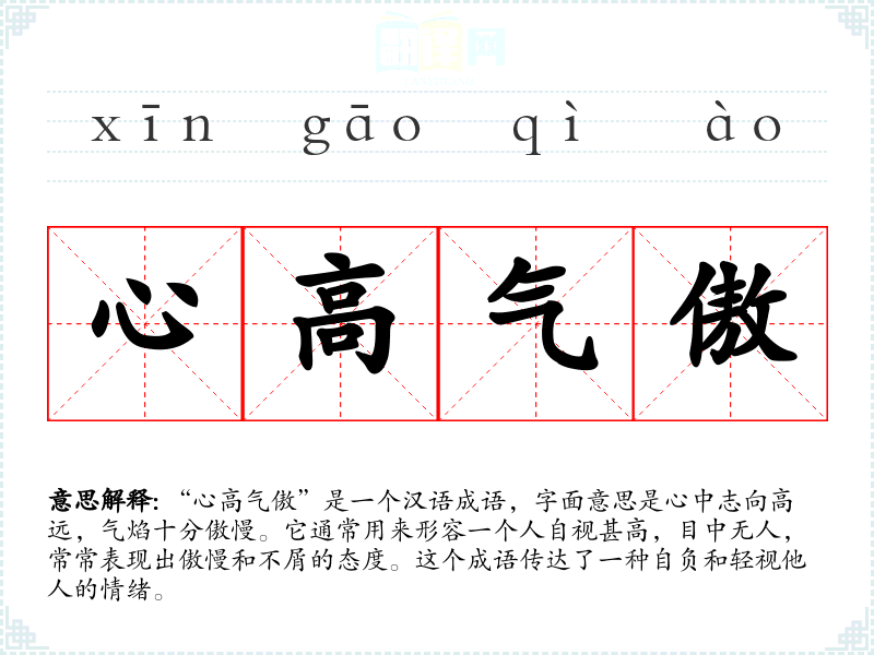 “心高气傲”是一个汉语成语,字面意思是心中志向高远,气焰十分傲慢。它通常用来形容一个人自视甚高,目中无人,常常表现出傲慢和不屑的态度。这个成语传达了一种自负和轻视他人的情绪。