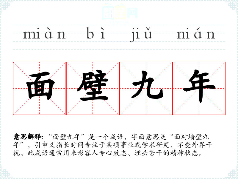 “面壁九年”是一个成语,字面意思是“面对墙壁九年”,引申义指长时间专注于某项事业或学术研究,不受外界干扰。此成语通常用来形容人专心致志、埋头苦干的精神状态。