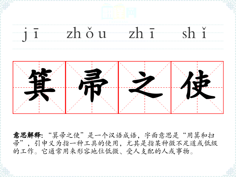 “箕帚之使”是一个汉语成语,字面意思是“用箕和扫帚”,引申义为指一种工具的使用,尤其是指某种微不足道或低级的工作。它通常用来形容地位低微、受人支配的人或事物。