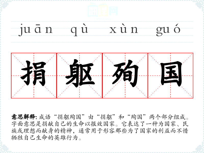 | 为国捐躯 | 捐:献;躯:身体,指生命。为国家牺牲生命。 |