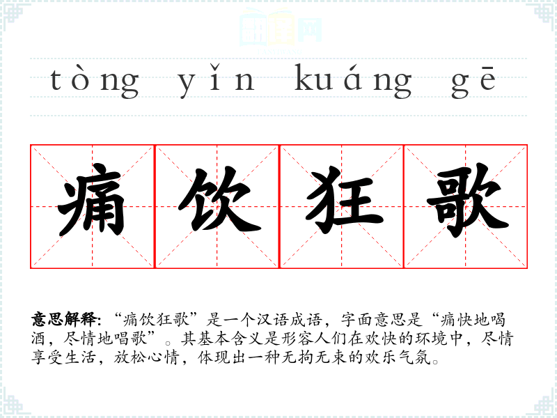 “痛饮狂歌”是一个汉语成语,字面意思是“痛快地喝酒,尽情地唱歌”。其基本含义是形容人们在欢快的环境中,尽情享受生活,放松心情,体现出一种无拘无束的欢乐气氛。