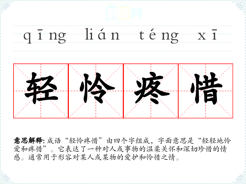 成语“轻怜疼惜”由四个字组成,字面意思是“轻轻地怜爱和疼惜”。它表达了一种对人或事物的温柔关怀和深切珍惜的情感。通常用于形容对某人或某物的爱护和怜惜之情。