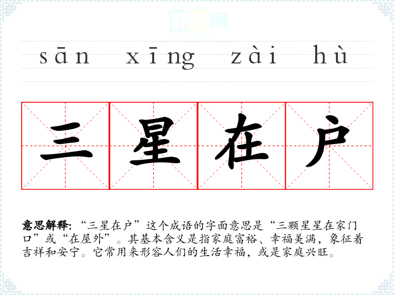 “三星在户”这个成语的字面意思是“三颗星星在家门口”或“在屋外”。其基本含义是指家庭富裕、幸福美满,象征着吉祥和安宁。它常用来形容人们的生活幸福,或是家庭兴旺。
