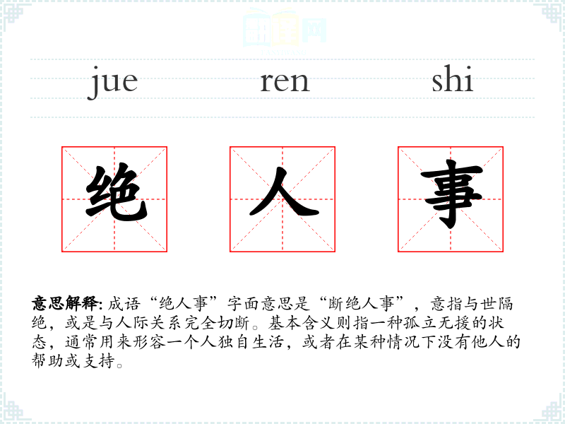 成语“绝人事”字面意思是“断绝人事”,意指与世隔绝,或是与人际关系完全切断。基本含义则指一种孤立无援的状态,通常用来形容一个人独自生活,或者在某种情况下没有他人的帮助或支持。