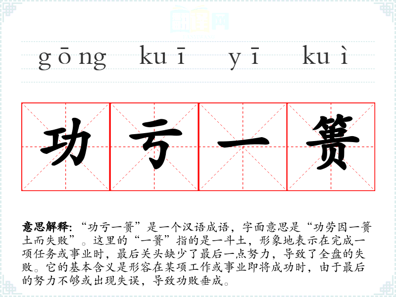 “功亏一篑”是一个汉语成语,字面意思是“功劳因一篑土而失败”。这里的“一篑”指的是一斗土,形象地表示在完成一项任务或事业时,最后关头缺少了最后一点努力,导致了全盘的失败。它的基本含义是形容在某项工作或事业即将成功时,由于最后的努力不够或出现失误,导致功败垂成。