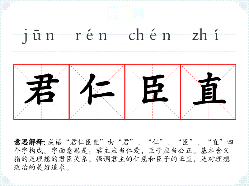 成语“君仁臣直”由“君”、“仁”、“臣”、“直”四个字构成。字面意思是:君主应当仁爱,臣子应当公正。基本含义指的是理想的君臣关系,强调君主的仁慈和臣子的正直,是对理想政治的美好追求。