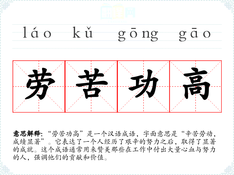 “劳苦功高”是一个汉语成语,字面意思是“辛苦劳动,成绩显著”。它表达了一个人经历了艰辛的努力之后,取得了显著的成就。这个成语通常用来赞美那些在工作中付出大量心血与努力的人,强调他们的贡献和价值。