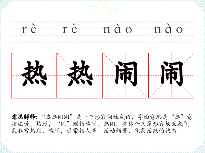 “热热闹闹”是一个形容词性成语,字面意思是“热”意指温暖、热烈,“闹”则指喧闹、热闹。整体含义是形容场面或气氛非常热烈、喧闹,通常指人多、活动频繁、气氛活跃的状态。